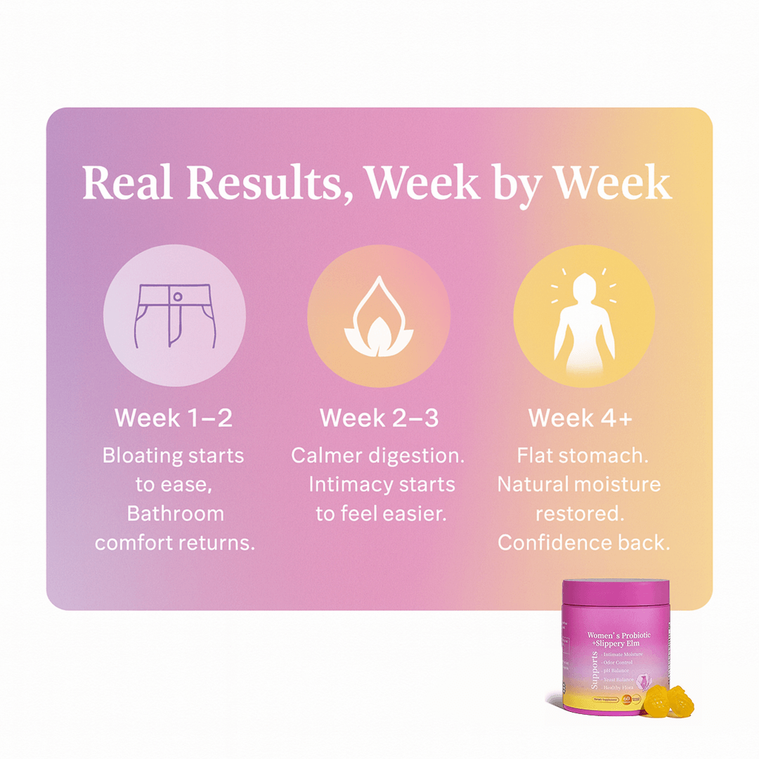 Most women notice reduced bloating within 2 weeks. Digestive improvements typically follow, with intimate comfort benefits usually apparent by week 4.